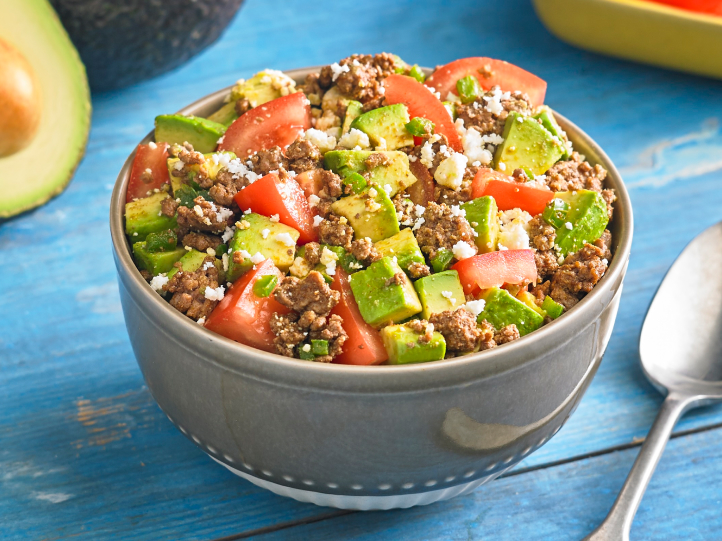 Add beef mixture, tomato and queso fresco to guacamole and gently stir until well combined.