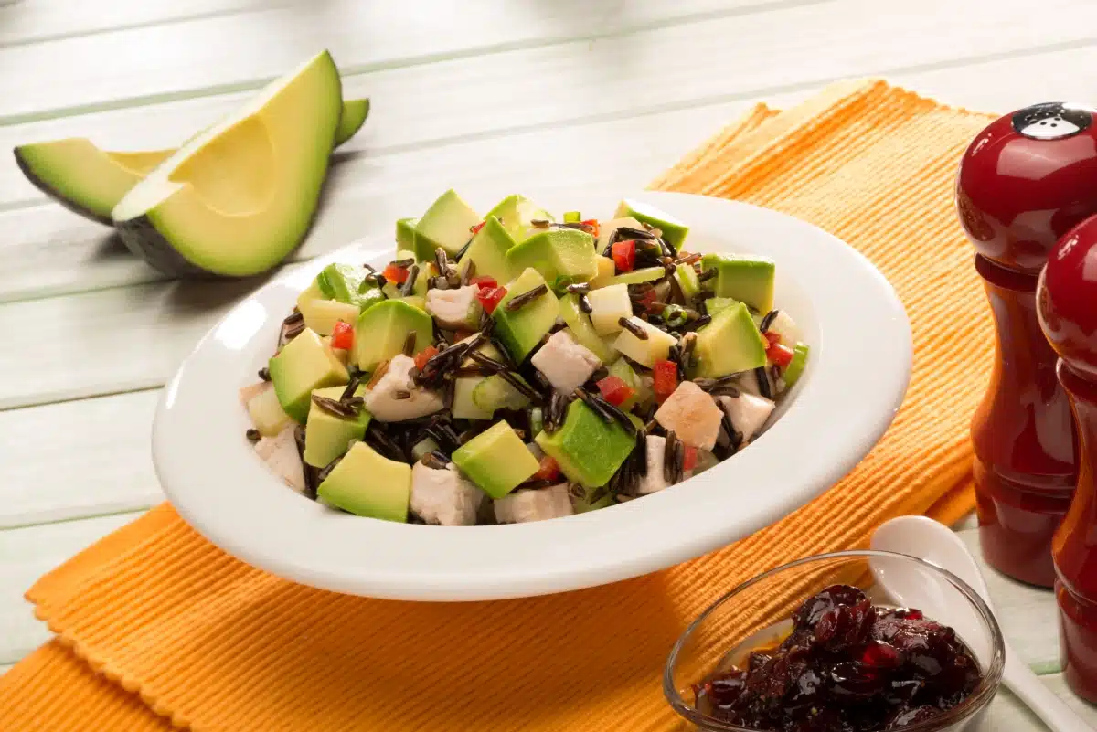 Add the rice, sweet potato, turkey, avocado, red bell pepper, celery and half the scallions and toss well. Taste for salt, add more if need be. Garnish with rest of the scallions and serve.